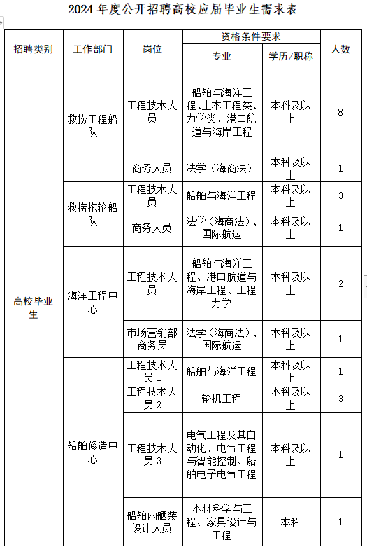 ?。ㄎ澹父咝.厴I(yè)生接收計劃的應為2024年應屆畢業(yè)生,并如期取得畢業(yè)證書。其中,應聘陸地管理崗位的(含救撈工程船隊商務人員、海洋工程中心市場營銷部商務員、船舶修造中心船舶內(nèi)舾裝設計人員、財務核算、人事管理崗),應取得2024年度國家公務員考試筆試合格成績。