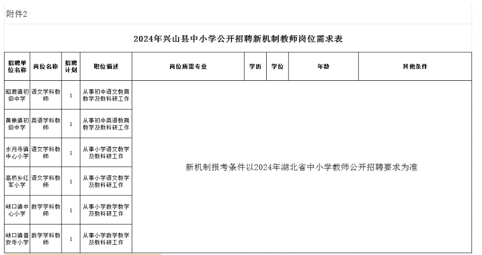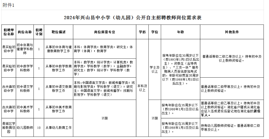 2.報考自主招聘中小學(幼兒園)教師崗位條件以《2024年興山縣中小學(幼兒園)公開自主招聘教師崗位需求表》(附件1)為準。