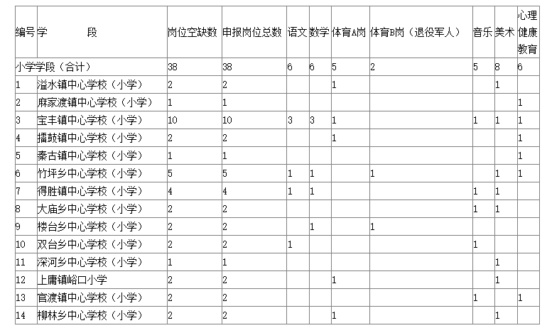 2024年竹山縣面向社會公開招聘98名中小學及幼兒園教師。其中新機制初中教師崗位14名,自主招聘初中教師崗位16名、小學教師崗位38名,幼兒園教師崗位30名。具體學段學科如下: