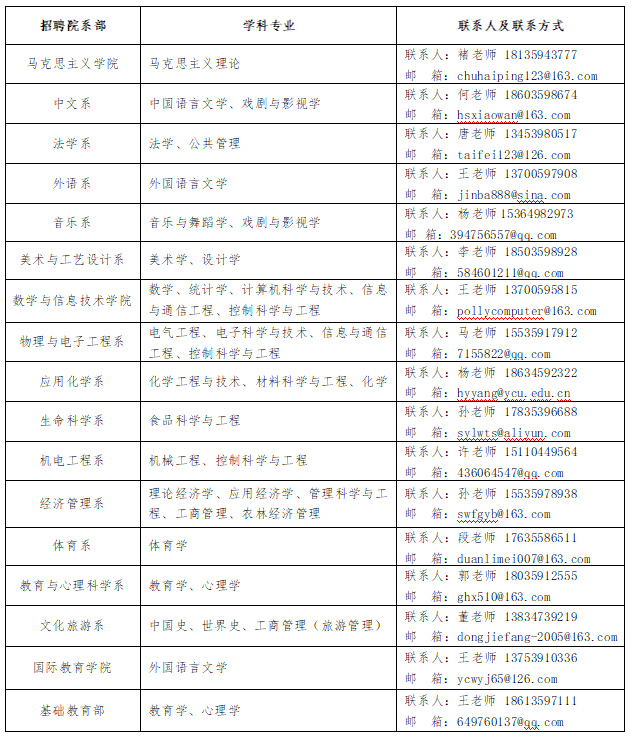 符合條件的國(境)內(nèi)外高校博士研究生通過電子郵箱報名應(yīng)聘,應(yīng)聘人員請將個人簡歷電子版發(fā)送至各院系部聯(lián)系人電子郵箱和ycxyrsc@ycu.edu.cn。應(yīng)聘者郵件標(biāo)題格式統(tǒng)一要求為:姓名+性別+學(xué)科(專業(yè))。