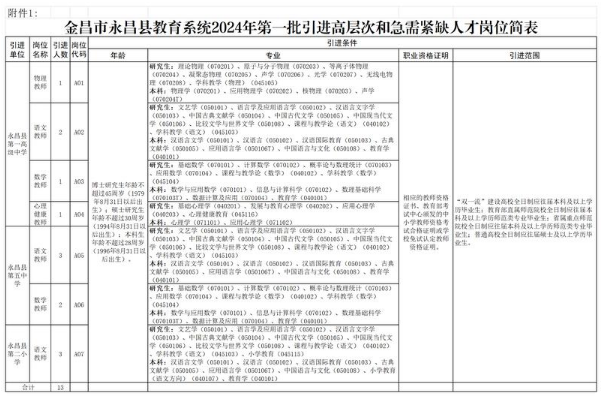 1.金昌市永昌縣教育系統(tǒng)2024年第一批引進高層次和急需緊缺人才崗位簡表