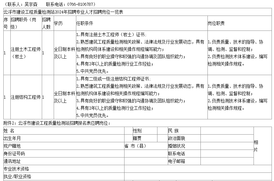 附件1:云浮市建設(shè)工程質(zhì)量檢測(cè)站2024年招聘專業(yè)人才招聘崗位一覽表