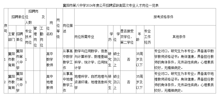 (一)襄陽市第八中學擬公開招聘緊缺高層次專業(yè)人才 2名。崗位條件詳情見《襄陽市第八中學2024年度公開招聘緊缺高層次專業(yè)人才崗位一覽表》。