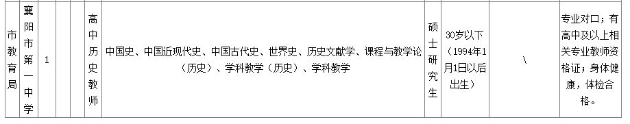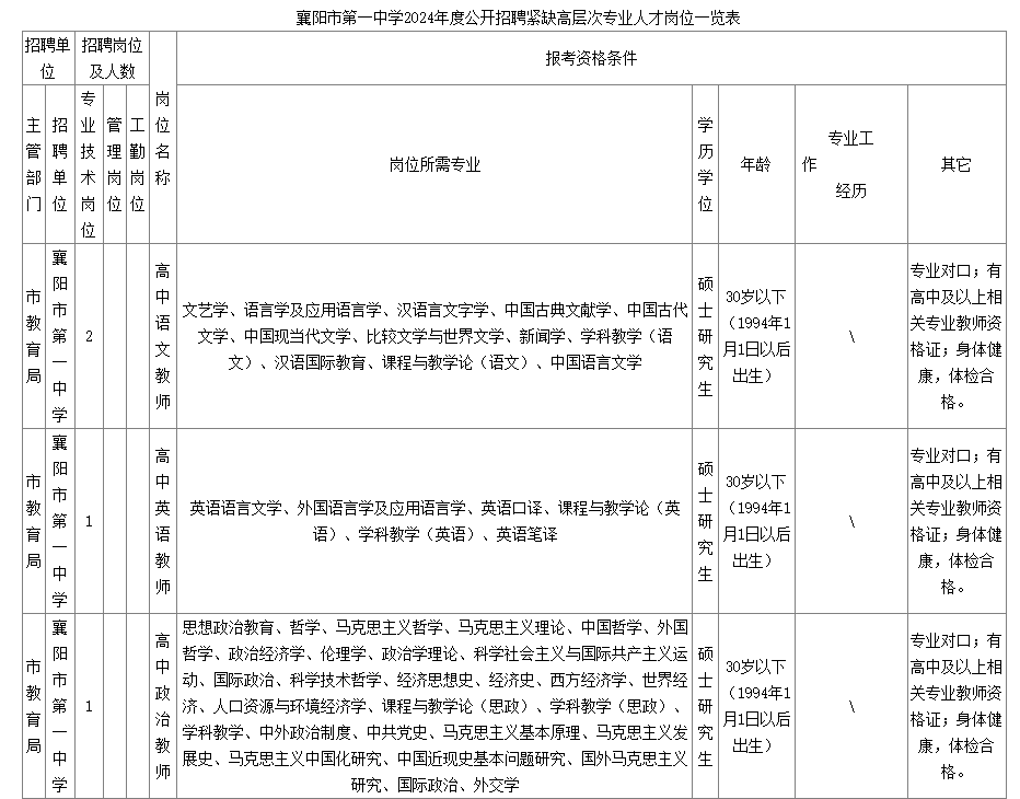 ?。ㄒ唬┫尻?yáng)市第一中學(xué)擬公開(kāi)招聘緊缺高層次專業(yè)人才5名。招聘對(duì)象為2024年畢業(yè)或往屆畢業(yè)且尚未就業(yè)的普通高等院校碩士研究生及以上學(xué)歷緊缺高層次專業(yè)人才(境外留學(xué)的研究生應(yīng)有教育部出具的相關(guān)學(xué)歷認(rèn)證),崗位條件詳情見(jiàn)《襄陽(yáng)市第一中學(xué)2024年度公開(kāi)招聘緊缺高層次專業(yè)人才崗位一覽表》。