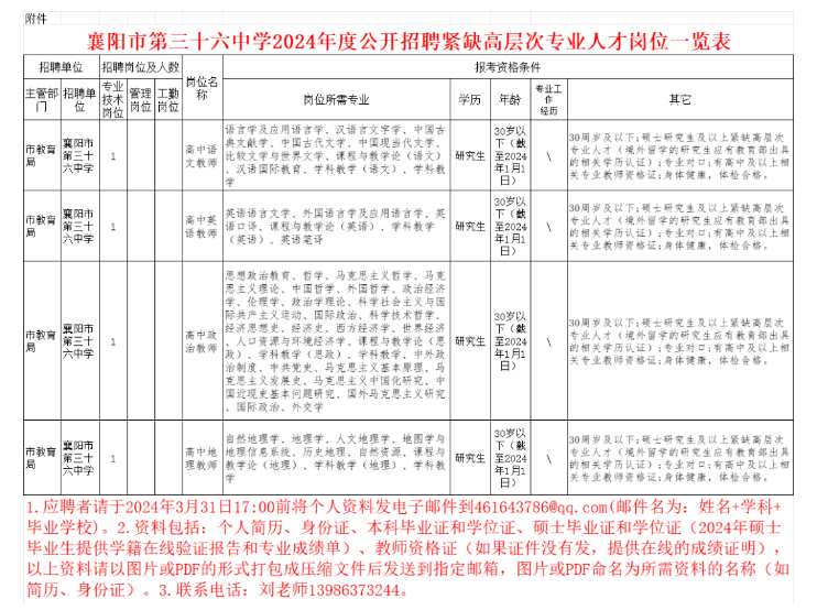 (一)襄陽市第三十六中學擬公開招聘緊缺高層次專業(yè)人才4名。崗位條件詳情見《襄陽市第三十六中學2024年度公開招聘緊缺高層次專業(yè)人才崗位一覽表》。