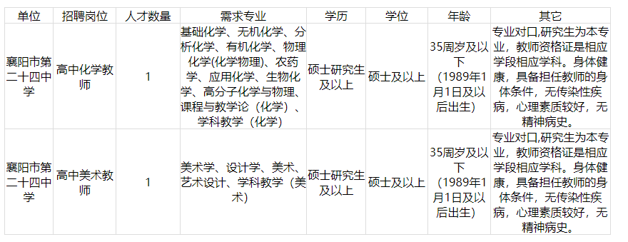 襄陽市第二十四中學(xué)2024年度公開招聘緊缺高層次專業(yè)人才崗位一覽表