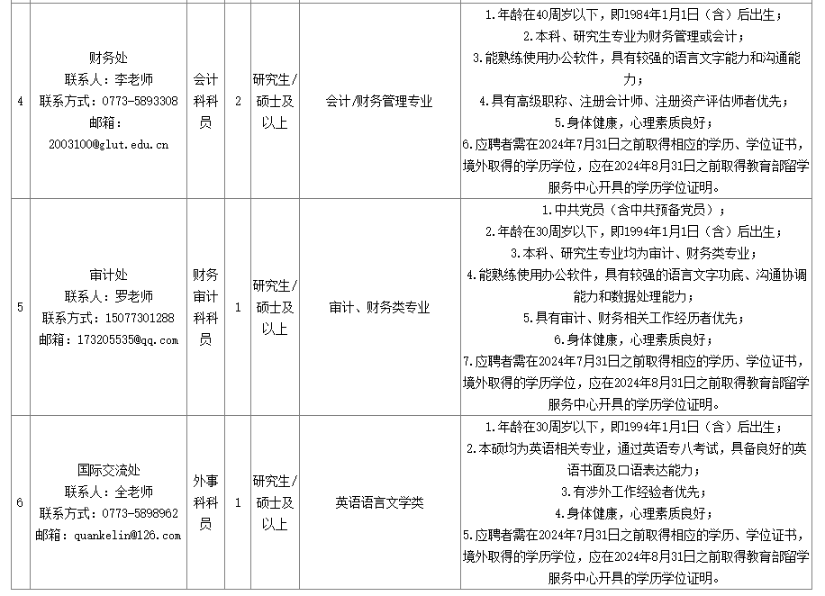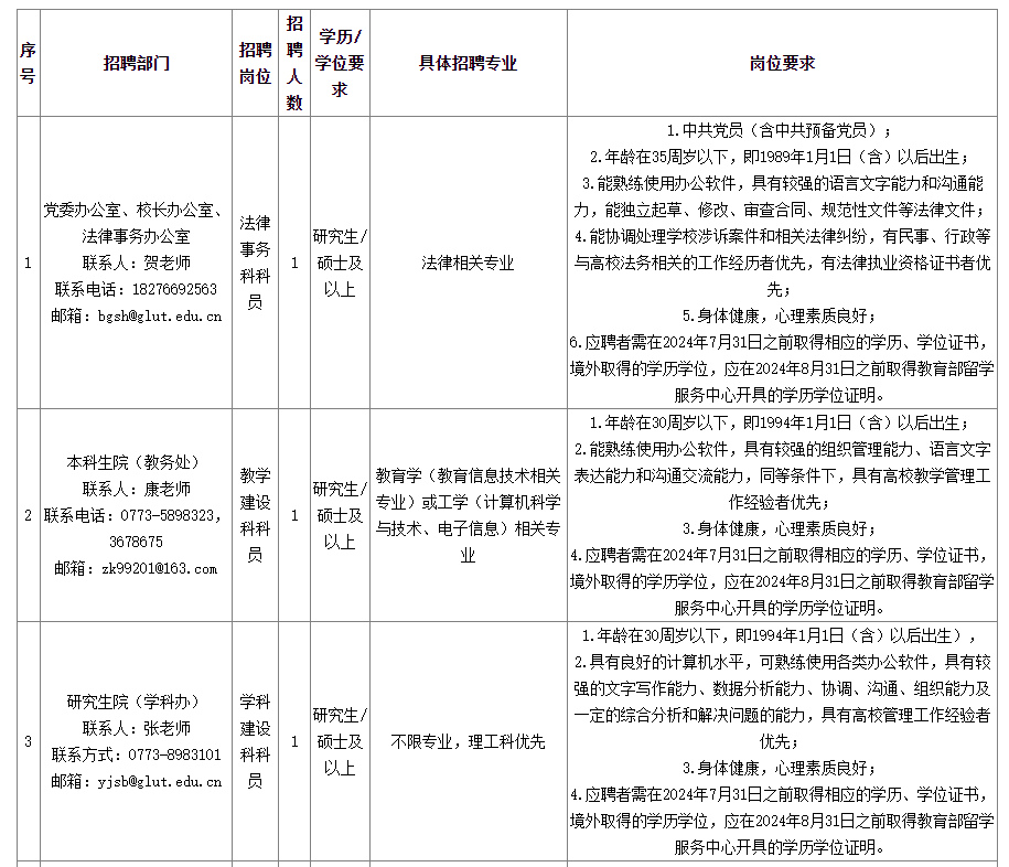 具體招聘事宜請聯(lián)系各招聘部門負(fù)責(zé)人;其他未盡事宜請聯(lián)系人事處咨詢,聯(lián)系人:丑老師或周老師,聯(lián)系電話:0773-2670319。