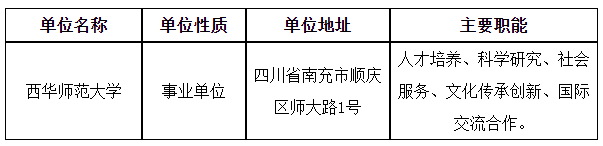 根據(jù)《事業(yè)單位人事管理?xiàng)l例》《事業(yè)單位公開招聘人員暫行規(guī)定》和《四川省省屬事業(yè)單位公開招聘工作人員實(shí)施細(xì)則(試行)》等有關(guān)規(guī)定,經(jīng)四川省教育廳備案,我單位擬面向社會(huì)公開招聘20名工作人員?,F(xiàn)將公開招聘有關(guān)事項(xiàng)公告如下(本公告同時(shí)在四川省人力資源和社會(huì)保障廳(以下簡稱省人社廳)官網(wǎng)[http://rst.sc.gov.cn/,下同]“人事考試”專欄、省教育廳官網(wǎng)[http://edu.sc.gov.cn/,下同]和西華師范大學(xué)官網(wǎng)[https://www.cwnu.edu.cn/,下同]上發(fā)布)。