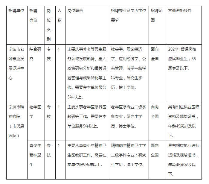 根據(jù)《寧波市事業(yè)單位公開招聘工作人員實(shí)施辦法》的有關(guān)規(guī)定,寧波市民政局所屬事業(yè)單位寧波市老齡事業(yè)發(fā)展促進(jìn)中心和寧波市精神病院(市民康醫(yī)院)決定面向全國公開招聘高層次人才3名?,F(xiàn)就有關(guān)事項(xiàng)公告如下: