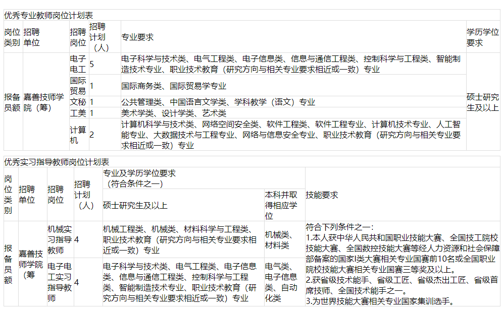 嘉善縣教育局2024年嘉善技師學(xué)院(籌)赴高校招聘優(yōu)秀教師公告