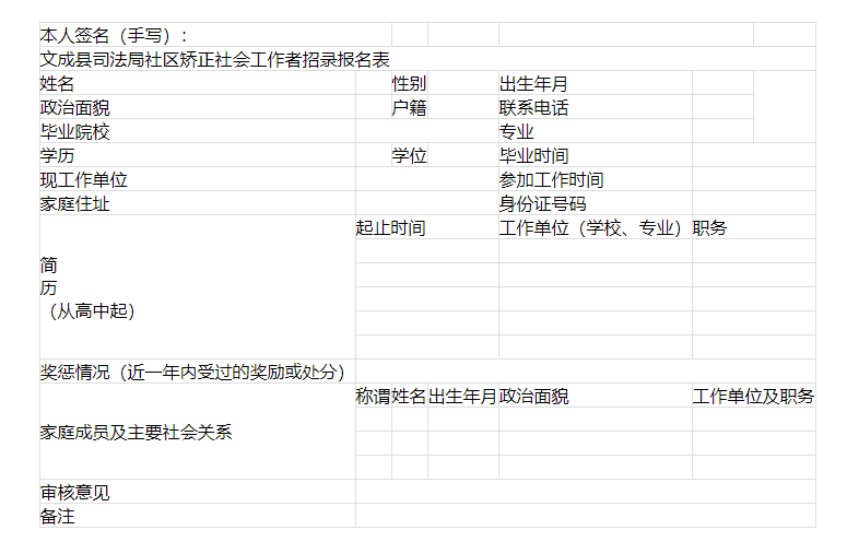 附件:文成縣司法局社區(qū)矯正社會(huì)工作者招錄報(bào)名表。
