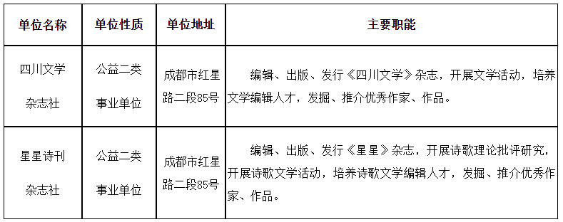 因工作需要,四川省作家協(xié)會(huì)所屬四川文學(xué)雜志社、星星詩刊雜志社2個(gè)事業(yè)單位計(jì)劃面向川渝兩地范圍內(nèi)的在編在崗事業(yè)單位工作人員、公務(wù)員(含參照公務(wù)員法管理單位工作人員)公開選調(diào)工作人員2名。根據(jù)《四川省事業(yè)單位工作人員流(調(diào))動(dòng)試行辦法》等有關(guān)規(guī)定,公告如下。(本公告由省作協(xié)同時(shí)在四川省人力資源和社會(huì)保障廳官網(wǎng)[rst.sc.gov.cn,下同]“人事考試”專欄和四川作家網(wǎng)[www.sczjw.net.cn,下同]上發(fā)布)