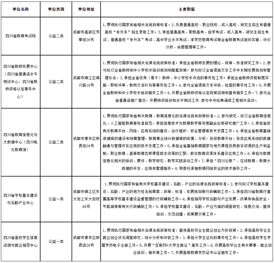 本次選調(diào)涉及教育廳所屬四川省教育考試院、四川省教師發(fā)展中心、四川省教育信息化與大數(shù)據(jù)中心、四川省學(xué)?;窘ㄔO(shè)與后勤產(chǎn)業(yè)中心、四川省高校學(xué)生信息咨詢與就業(yè)指導(dǎo)中心共5家事業(yè)單位6個(gè)崗位(共6個(gè)選調(diào)名額)。其中,四川省教育考試院管理崗位2個(gè)、四川省教師發(fā)展中心專業(yè)技術(shù)崗位1個(gè)、四川省教育信息化與大數(shù)據(jù)中心專業(yè)技術(shù)崗位1個(gè)、四川省學(xué)?;窘ㄔO(shè)與后勤產(chǎn)業(yè)中心管理崗位1個(gè)、四川省高校學(xué)生信息咨詢與就業(yè)指導(dǎo)中心專業(yè)技術(shù)崗位1個(gè)。