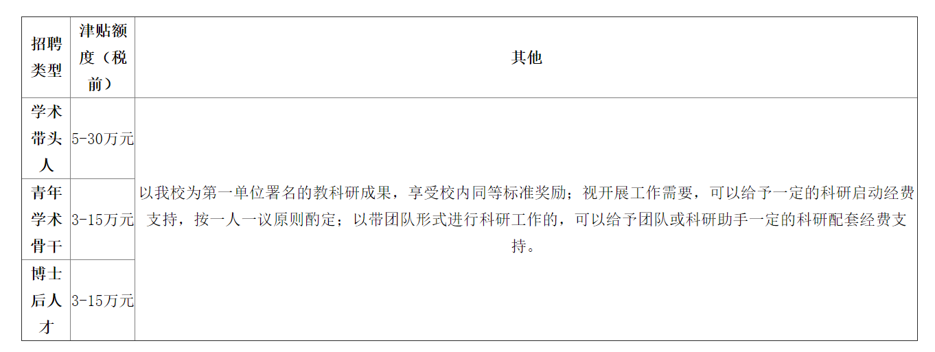 具體引進待遇詳見下表,特別優(yōu)秀或特殊情況者一事一議,一人一策。