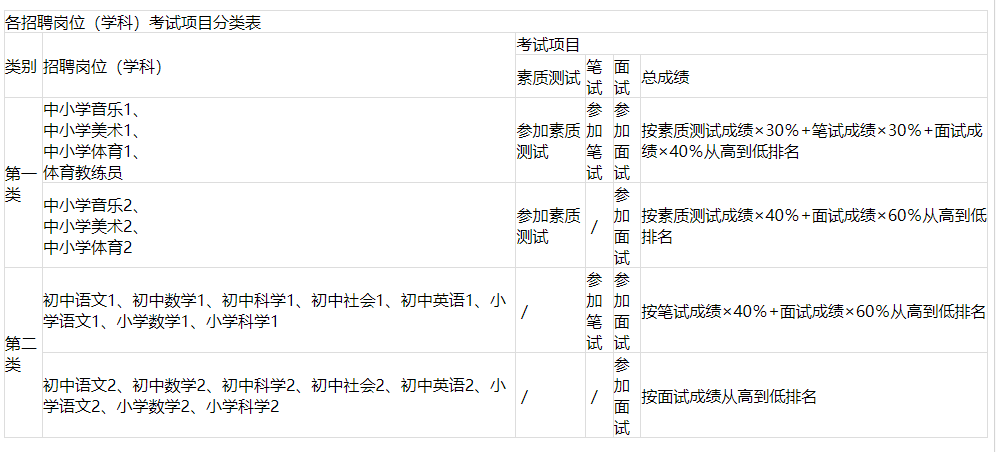 本次招聘分考試、體檢、考察(或政審)、公示和聘用,考試按照各招聘崗位(學(xué)科)分為兩大類,具體分類詳見《各招聘崗位(學(xué)科)考試項目分類表》。具體招聘程序如下: