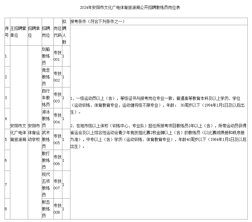 其他條件:詳見(附件1)《2024年安陽(yáng)市文化廣電體育旅游局公開招聘教練員崗位表 》中資格條件欄。
