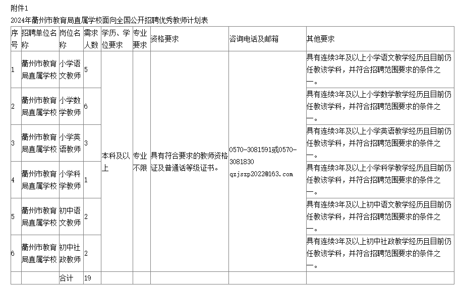 1.2024年衢州市教育局直屬學校面向全國公開招聘優(yōu)秀教師計劃表