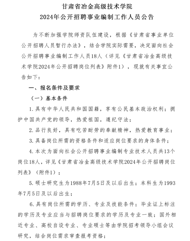 2024年甘肅省冶金高級技術(shù)學(xué)院招聘事業(yè)編制工作人員18人公告
