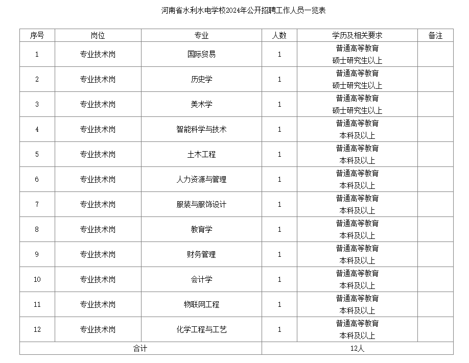 本次面向社會(huì)公開招聘工作人員12名,具體專業(yè)、人數(shù)等詳見《河南省水利水電學(xué)校2024年公開招聘工作人員一覽表》(附件)。
