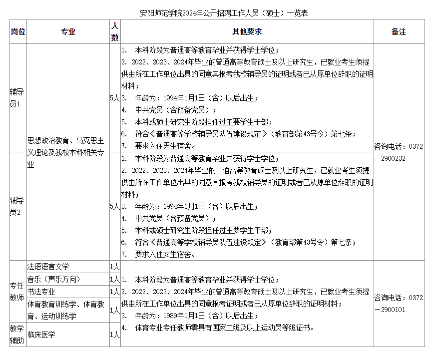 5. 崗位所需的專業(yè)和其他條件,詳見附件《安陽師范學(xué)院2024年公開招聘工作人員(碩士)一覽表》。