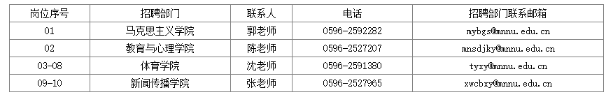 4.筆試和面試等具體事項(xiàng)和時(shí)間安排以及所有參考人員成績、進(jìn)入面試人選名單等事項(xiàng)請(qǐng)關(guān)注閩南師范大學(xué)教師工作部(人事處)網(wǎng)站通知公告欄。