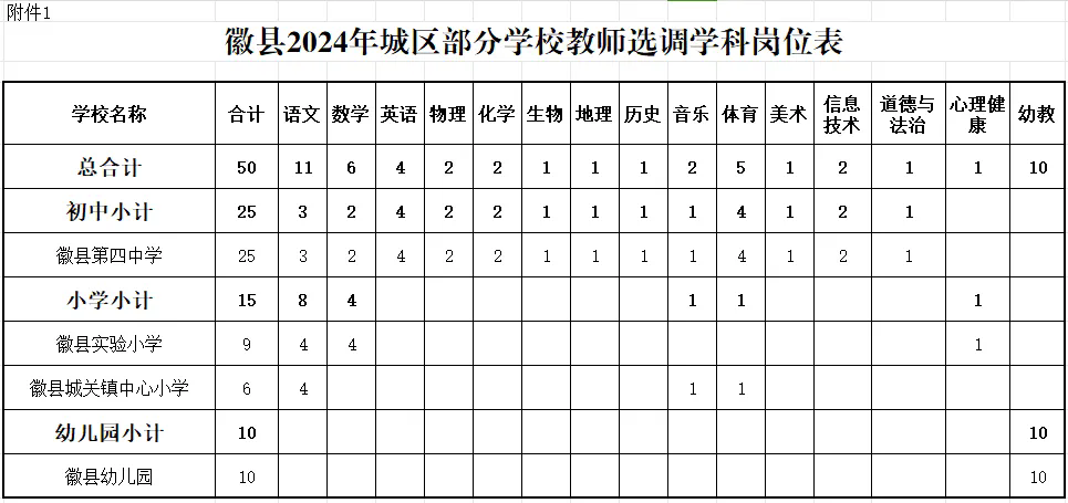 1.徽縣2024年城區(qū)部分學(xué)校教師選調(diào)學(xué)科崗位表