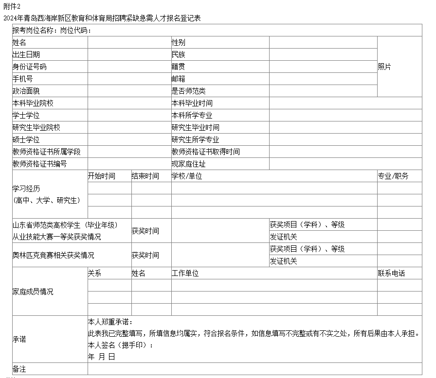 2.2024年青島西海岸新區(qū)教育和體育局招聘緊缺急需人才報名登記表