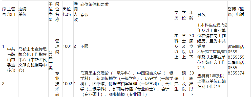 本次計(jì)劃面向全省公開選調(diào)事業(yè)單位工作人員3名。具體崗位及選調(diào)資格條件見《中共馬鞍山市委宣傳部所屬事業(yè)單位公開選調(diào)工作人員崗位計(jì)劃表》(見附件)。
