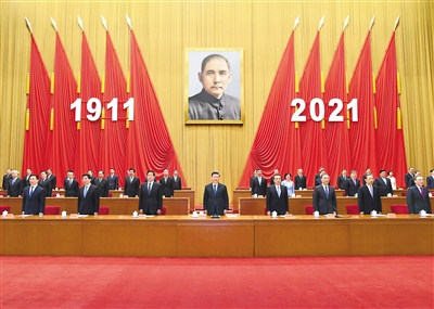人民大會堂大禮堂氣氛莊重熱烈。主席臺上方懸掛著“紀念辛亥革命110周年大會”會標,后幕正中是孫中山先生畫像,10面紅旗分列兩側(cè),上面懸掛的“1911”“2021”字標格外醒目。