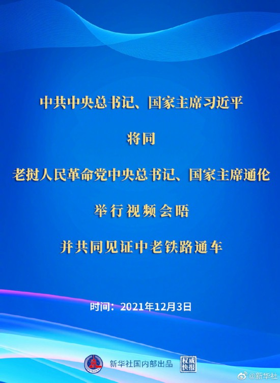 新華社北京12月1日電 外交部發(fā)言人華春瑩1日宣布:中共中央總書記、國家主席習(xí)近平將于12月3日同老撾人民革命黨中央總書記、國家主席通倫舉行視頻會晤,并以視頻連線形式共同見證中老鐵路通車。
