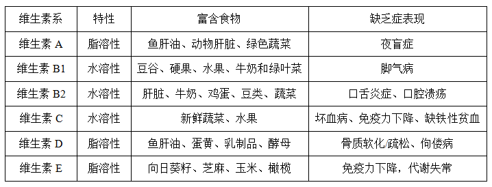 維生素是維持人體正常生理功能必需的一類化合物。經(jīng)常有同學(xué)會誤解維生素,它們能為我們提供能量么?它們能為我們構(gòu)筑細(xì)胞么?答案是:不能。它們不但不提供能量,也不是機體的構(gòu)造成分,但是維生素對于人體而言在膳食中是不可缺少的。如某種維生素長期缺乏或不足,即可引起代謝紊亂,以及出現(xiàn)病理狀態(tài)而形成維生素缺乏癥。下表為常見幾類維生素的特性: