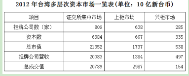 經(jīng)過50多年的發(fā)展,我國臺灣地區(qū)資本市場建立起由“證券交易所集中市場—上柜市場—興柜市場”構(gòu)成的完善成熟的多層級資本市場體系。今年由于金融海嘯、歐債危機等因素影響,臺灣多層次資本市場總體成交值從2010至2012年連續(xù)3年下降,2012年較2011年衰退23.38%。周轉(zhuǎn)率也呈現(xiàn)逐年下降趨勢,2012年證券交易所幾種市場周轉(zhuǎn)率為97%,上柜市場周轉(zhuǎn)率為175%,興柜市場周轉(zhuǎn)率為27%。