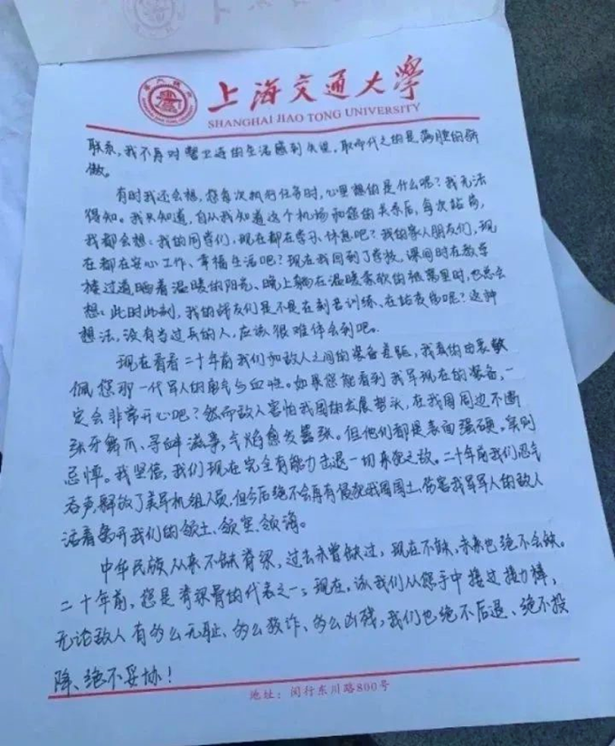 寫信人是上海交大本科生章原,2018年9月,他受王偉事跡鼓舞參軍入伍成為一名海軍戰(zhàn)士,這場跨越20年的“對話”中榜樣和信仰的力量無聲涌動。